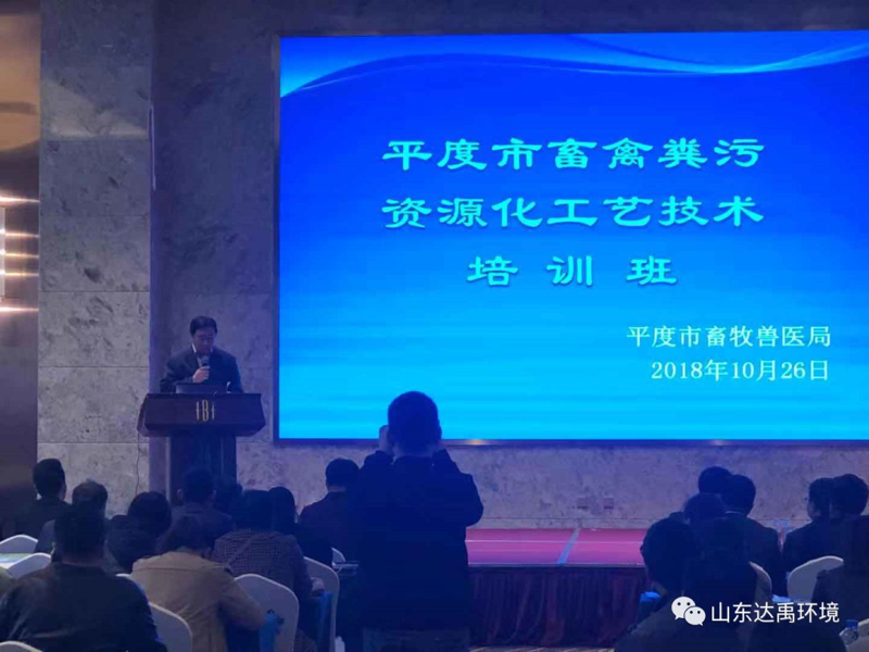 2018年10月26日,山東達(dá)禹環(huán)境工程有限公司受邀參加由平度市畜牧獸醫(yī)局主辦的平度市畜禽類糞污資源化工藝技術(shù)培訓(xùn)班,為平度地區(qū)200多養(yǎng)殖戶推廣糞污資源化工藝。